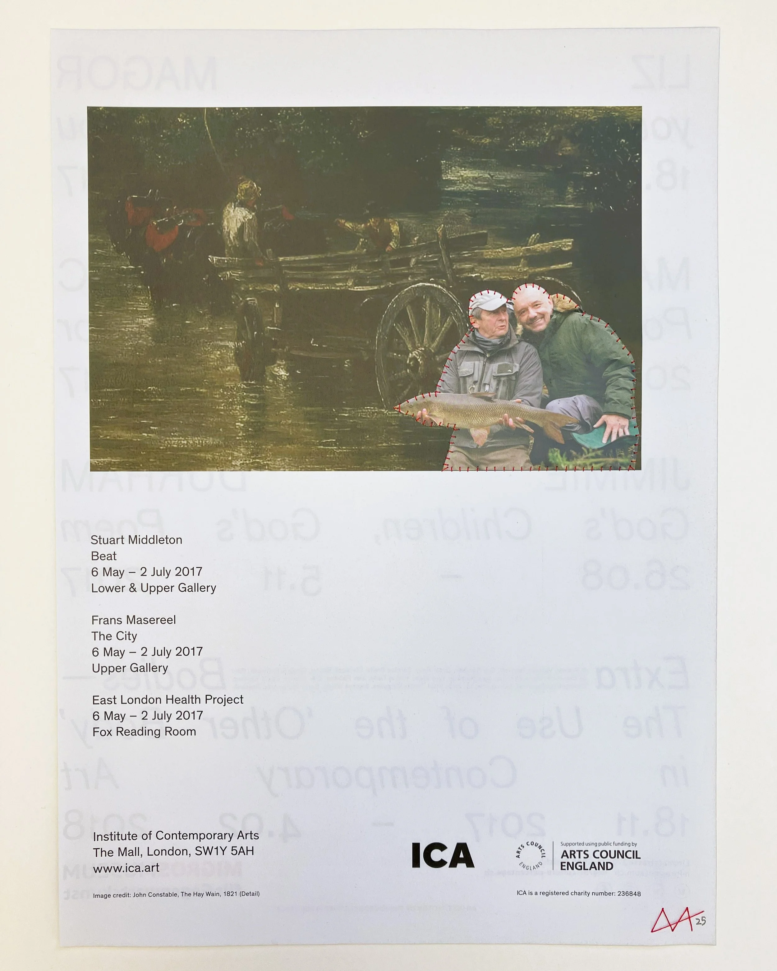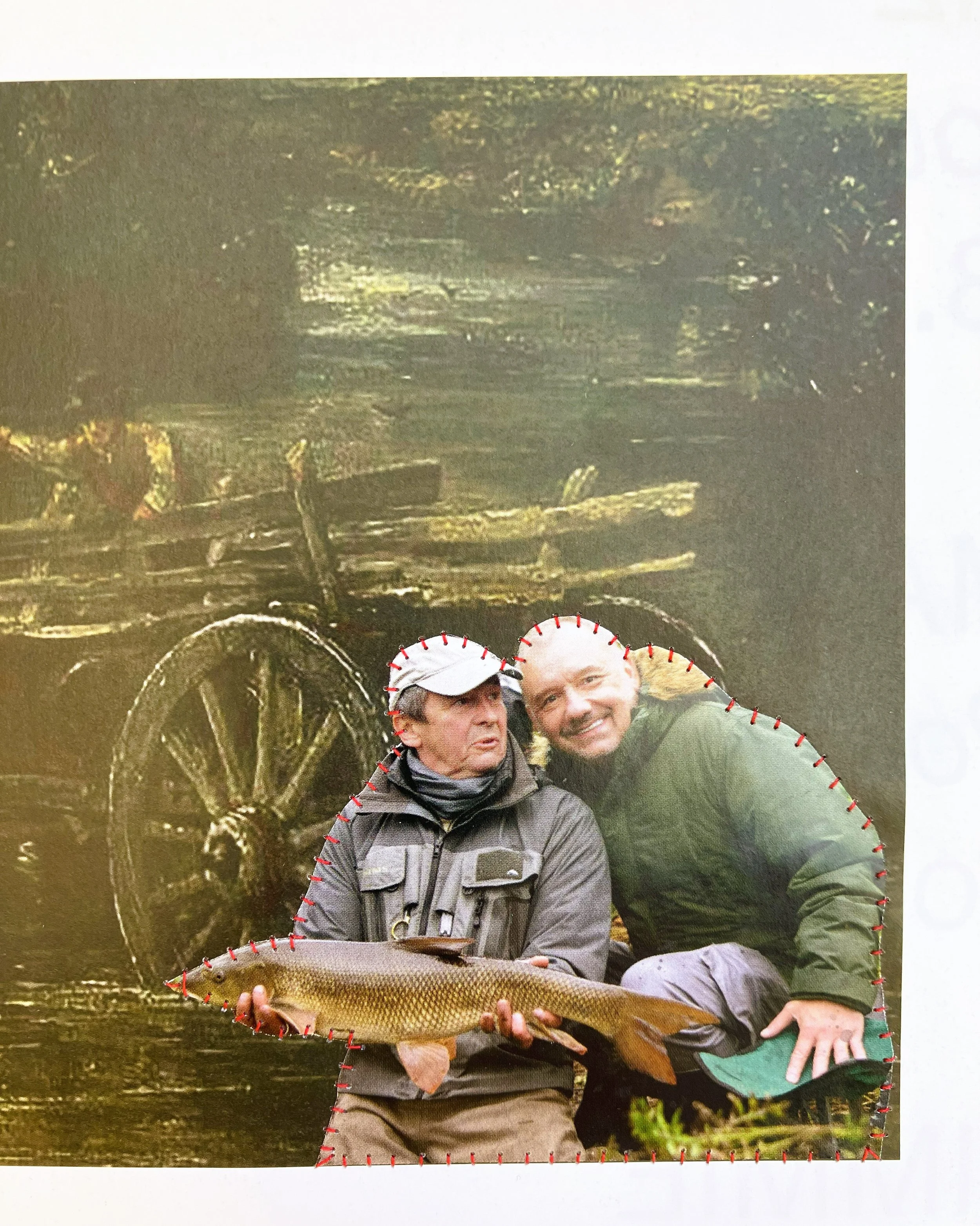 Made by stitching Bob Mortimer, Paul Whitehouse and a fish (photo by John Bailey, Gone Fishing, Blink Publishing, 2019) to a page (with a detail from The Hay Wain by John Constable, 1821, National Gallery, London) from a posh art magazine I took from the bin at work about 10 years ago.