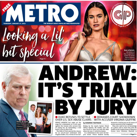 Face: Virginia Guiffre. Getty*. Metro 27.1.22. Article by Dominic Yeatman about Virginia Guiffre accusing Andrew Mountbatten Windsor of sexually abusing her when she was 17, and her lawyer saying, ‘We look forward to confronting Prince Andrew with his denials and attempts to blame Ms Guiffre for her own abuse’. The Windsors later paid £12m for an out-of-court settlement. In 2025 she took her own life, at the age of 41. “I am making it publicly known that in no way, shape or form am I suicidal. I have made this known to my therapist and doctor. If something happens to me – for the sake of my family do not let this go away and help me to protect them. Too many evil people want to see me quieted.” Virginia Guiffre.