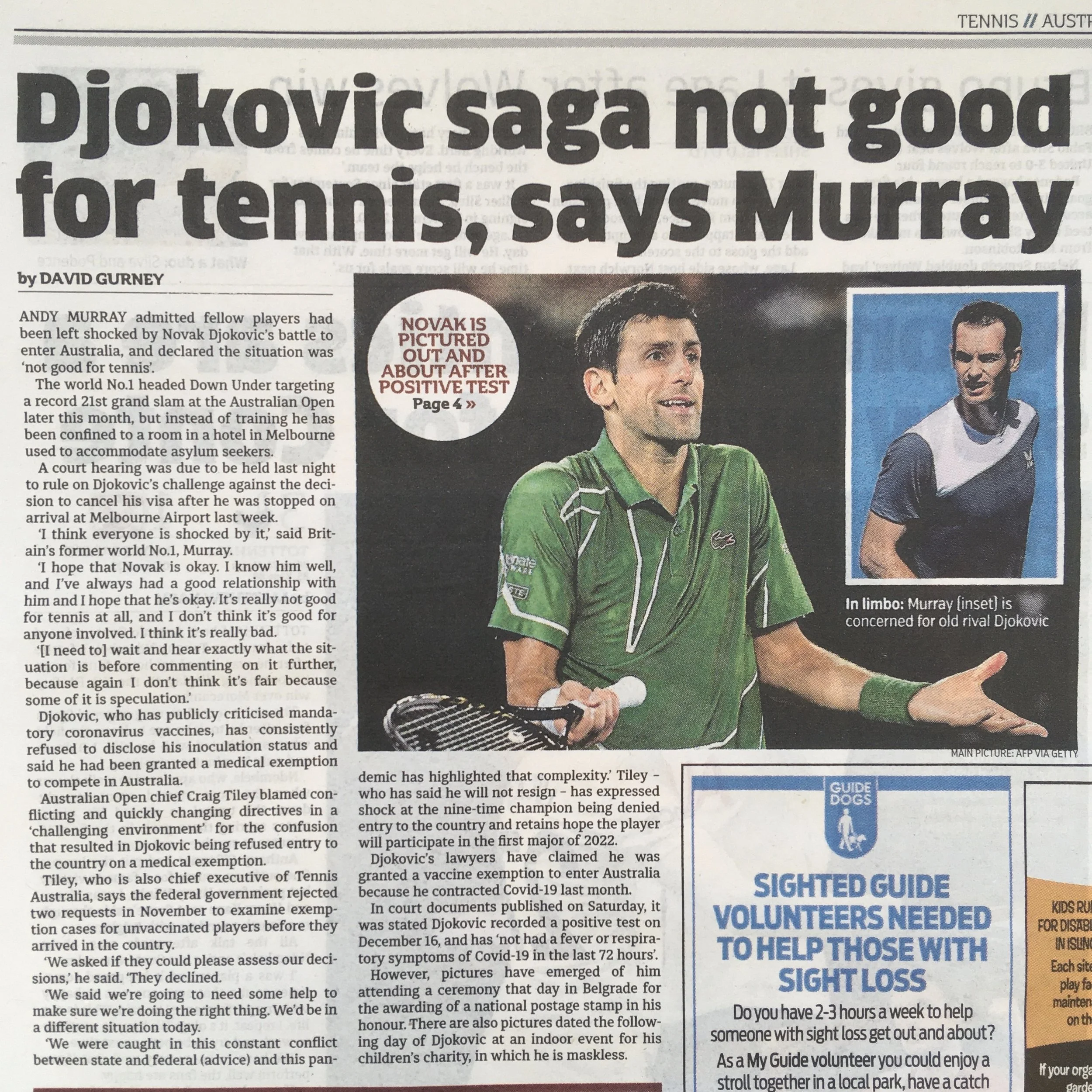 Green-sleeved arm: Novak Djokovic. AFP via Getty*. Metro 10.1.22. Article by David Gurney about the tennis player being kicked out of Australia, and the Open, for his refusal to get vaccinated against Covid-19.
