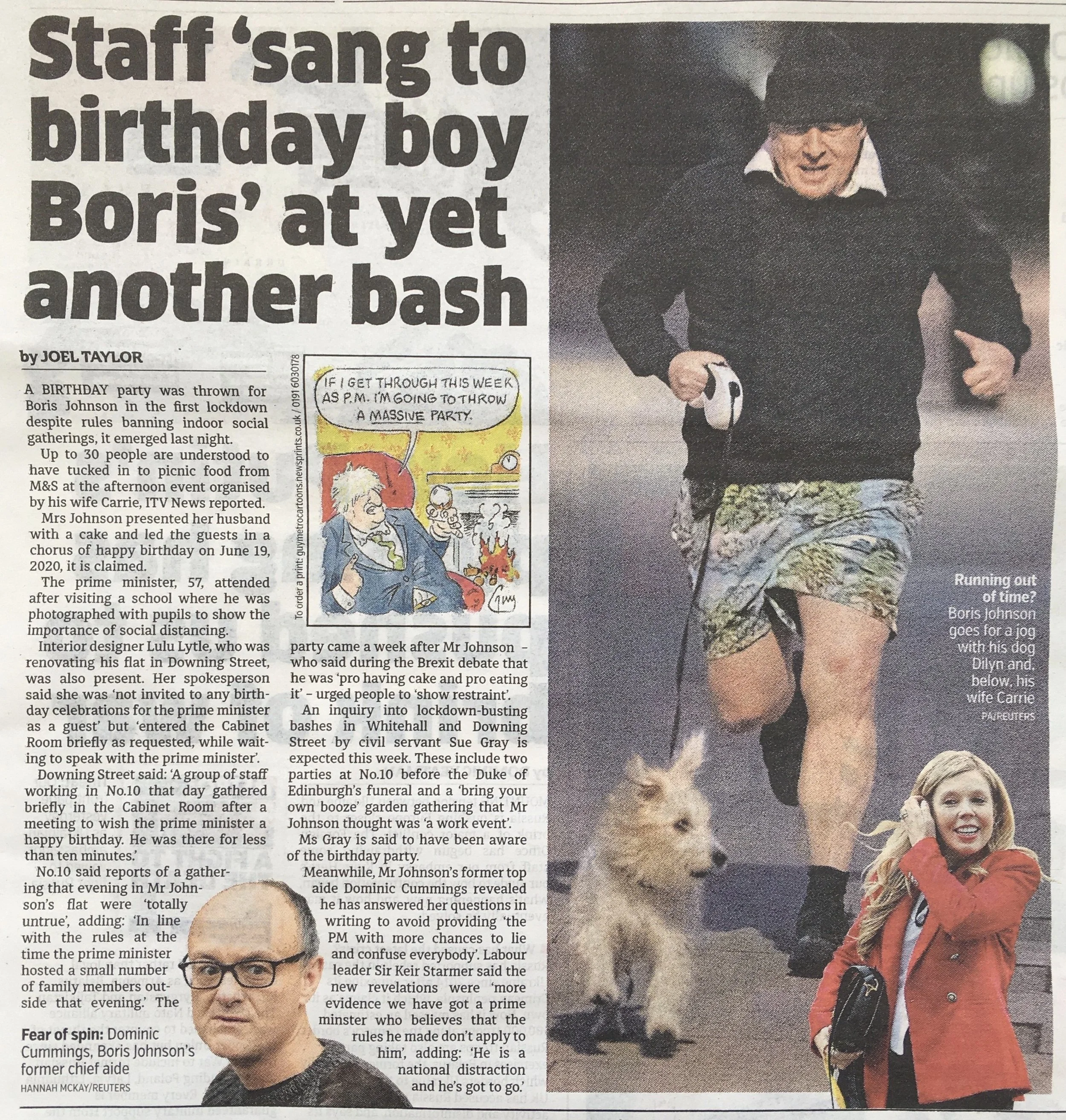Hand with dog: Boris Johnson. PA/ Reuters*. Metro 25.1.22. Article by Joel Taylor about a birthday party held for Boris Johnson during the first lockdown, despite rules banning indoor social events. It showed a picture of BJ jogging with his dog, Dilyn.