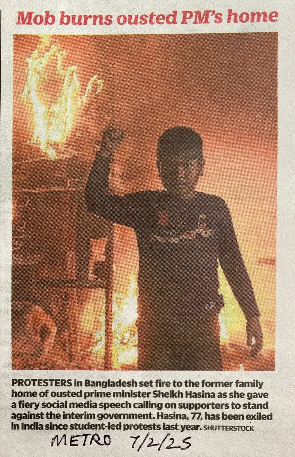 Day 39: Unnamed protester, Bangladesh Metro 7.2.25. Photo: Shutterstock*. Protesters in Bangladesh set fire to the former family home of ousted prime minister, Sheikh Hasina, who had ruled the country for 20 years.