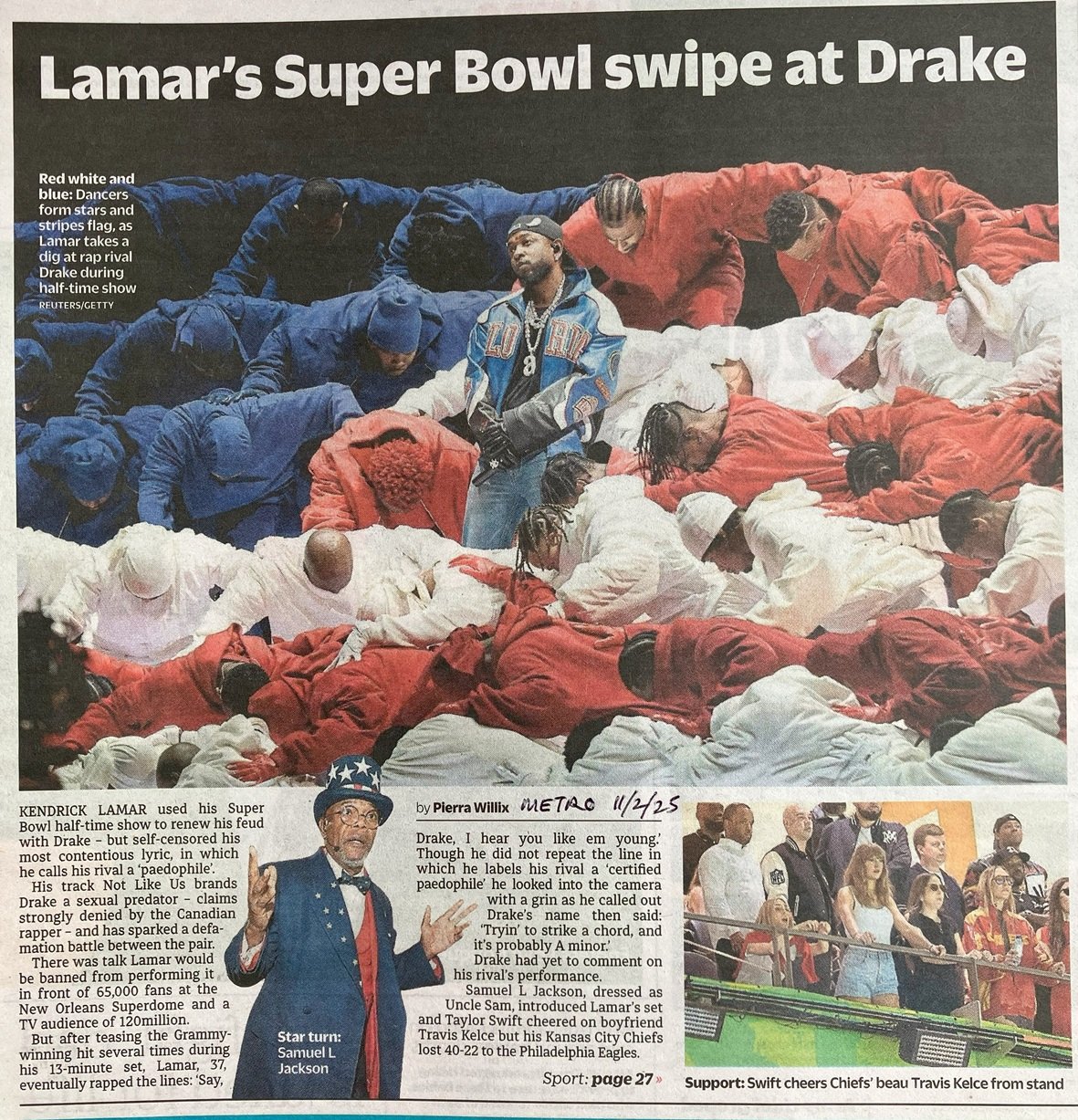 Day 46: Samuel L Jackson Metro 11.2.25. Article by Pierra Willix. Photo uncredited. Dressed as Uncle Sam at the Super Bowl and introduced Kendrick Lamar's half-time show.