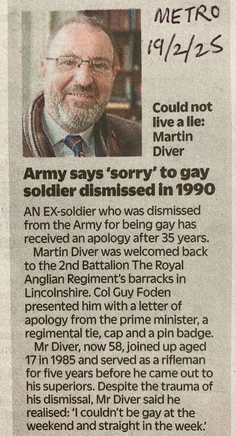 Day 49: Martin Diver Metro 19.2.25. Photo uncredited. Received an apology 35 years after being dismissed from the army for being gay.