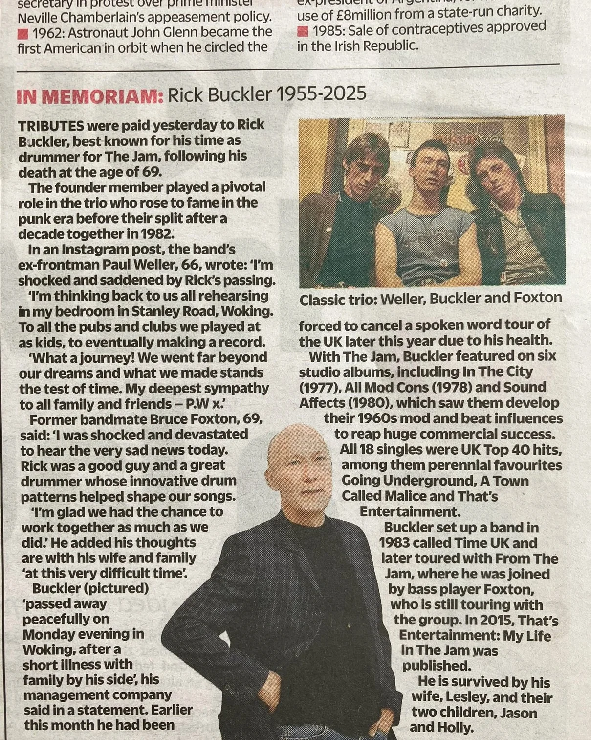 Day 52: Rick Buckler, 1955 - 2025 Metro 20.2.25.Photo uncredited.
