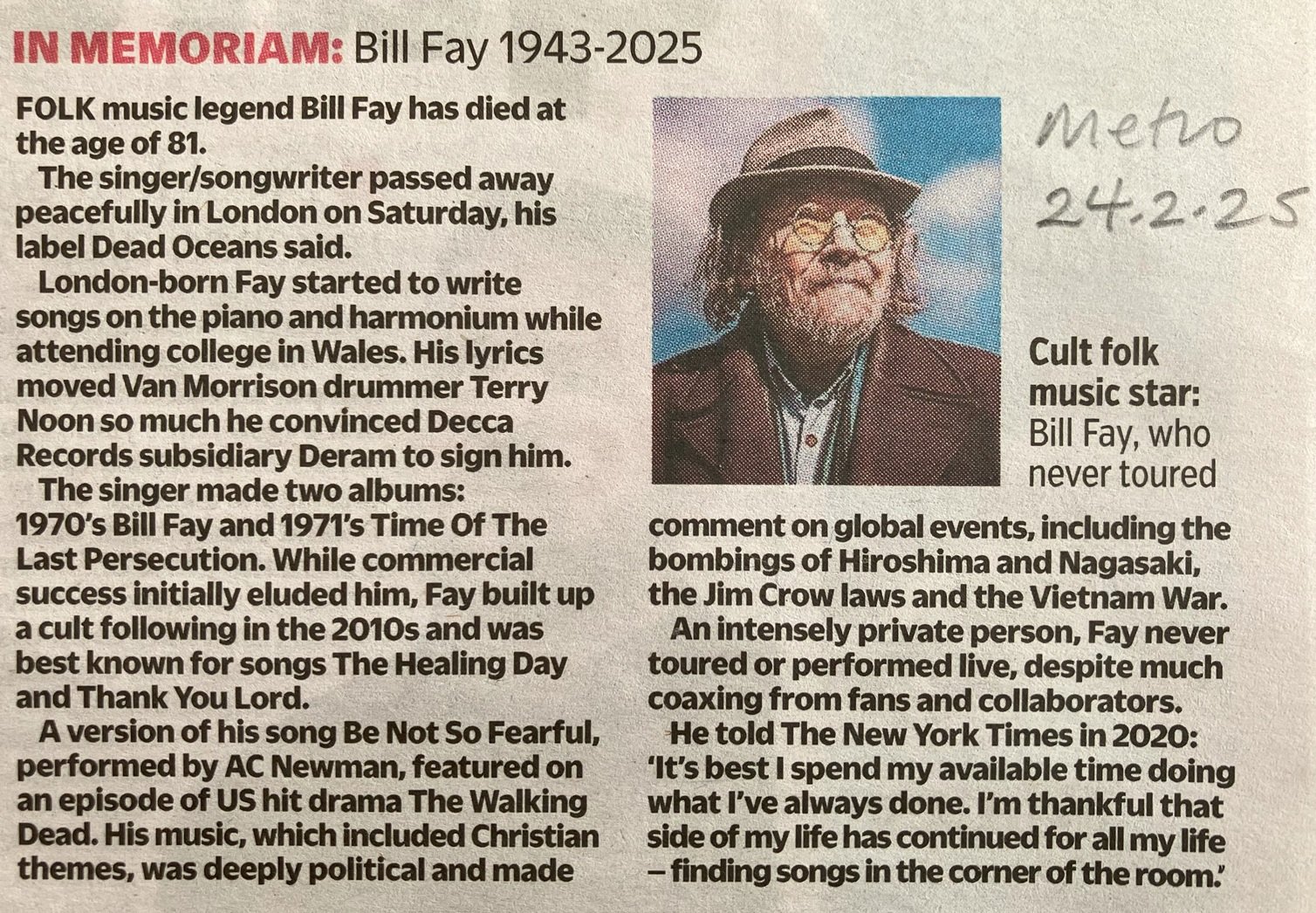 Day 55: Bill Fay, 1943 - 2025 Metro 24.2.25. Photo uncredited.