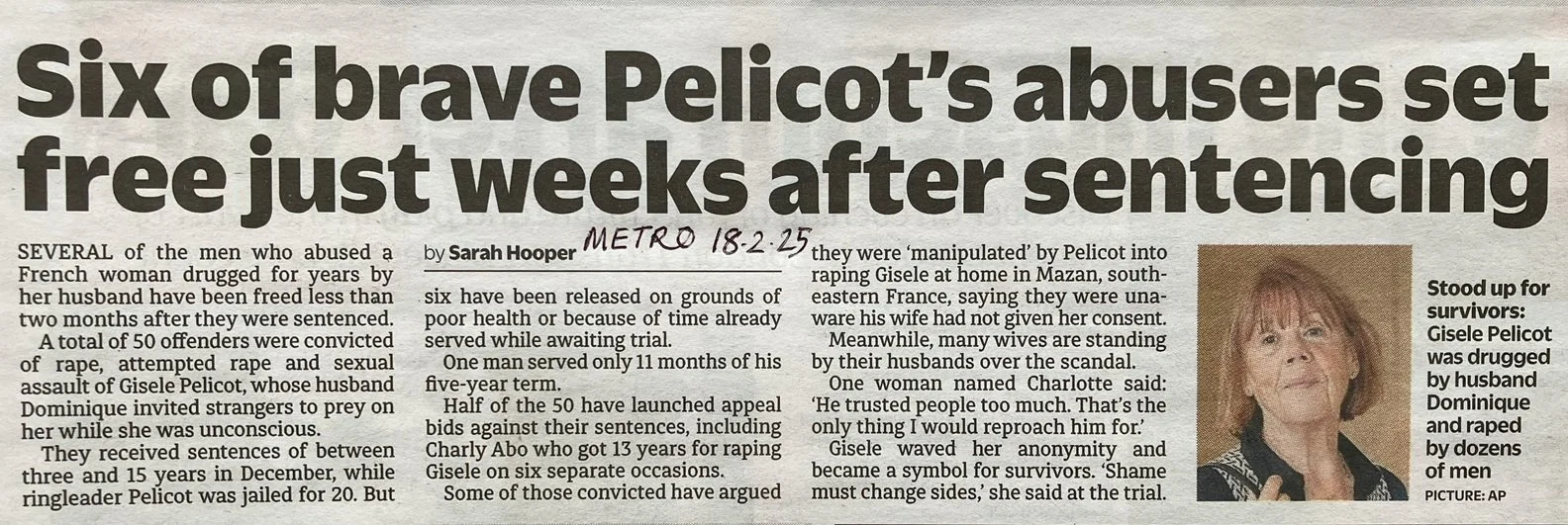 Day 54: Gisèle Pelicot Metro 18.2.25. Article by Sarah Hooper. Photo: AP*. Six of Pelicot's abusers 'set free just weeks after sentencing'.