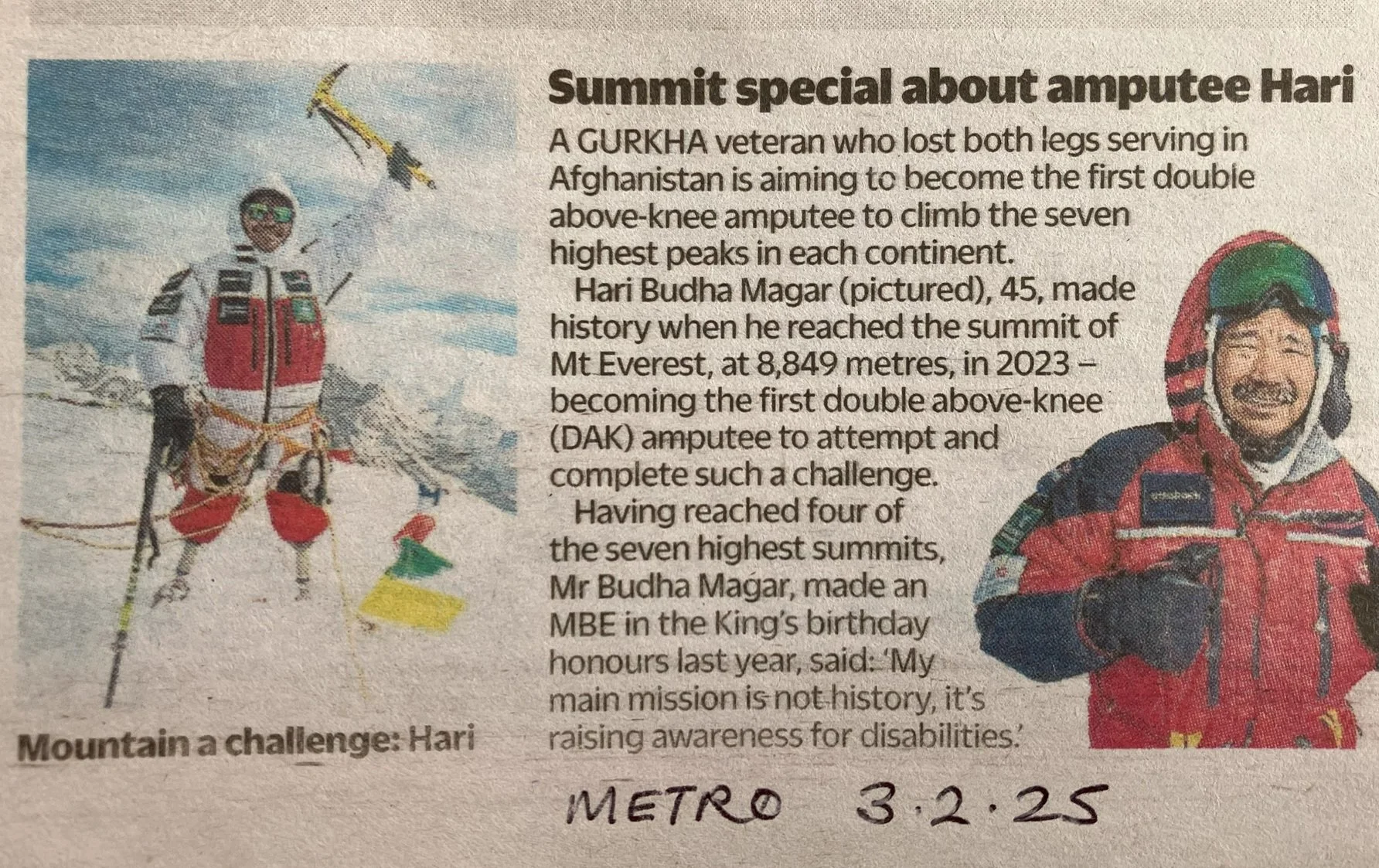 Day 32: Hari Budha Magar Metro 3.2.25. Photo uncredited. The first double above-knee amputee to climb the seven highest peaks in each continent.