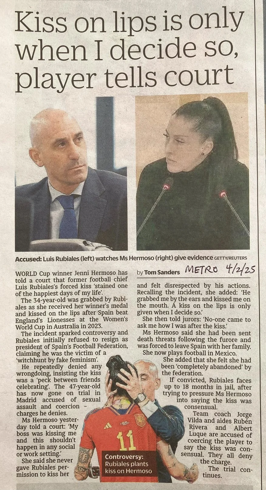 Day 35: Jenni Hermoso Metro 4.2.25. Article by: Tom Sanders. Photo: Getty/ Reuters*. The World Cup winner was forcefully grabbed and kissed on the lips by the president of Spain's Football Federation. Afterwards, he denied any wrongdoing and she was sent death threats.