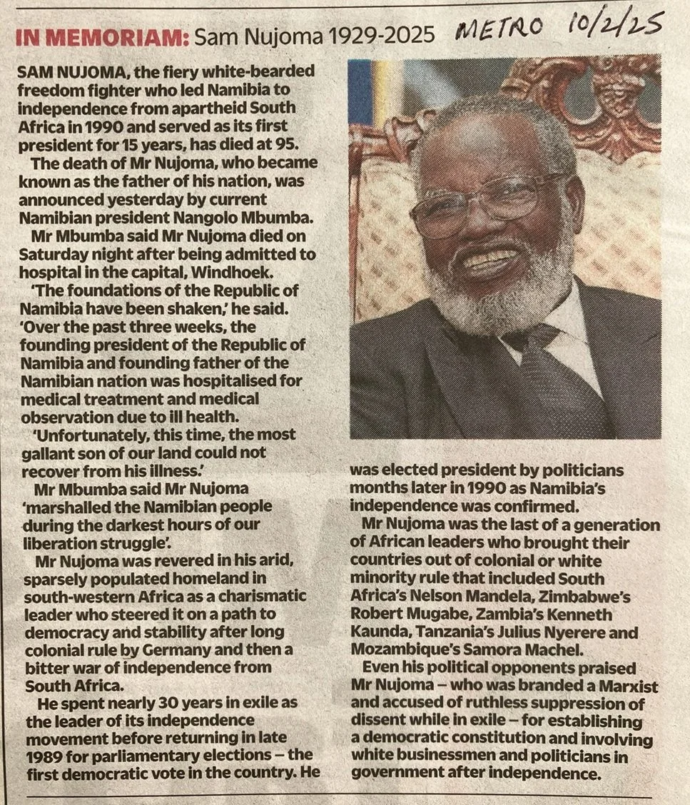 Day 41: Sam Nujoma, 1929 - 2025 Metro 10.2.25. Photo uncredited.