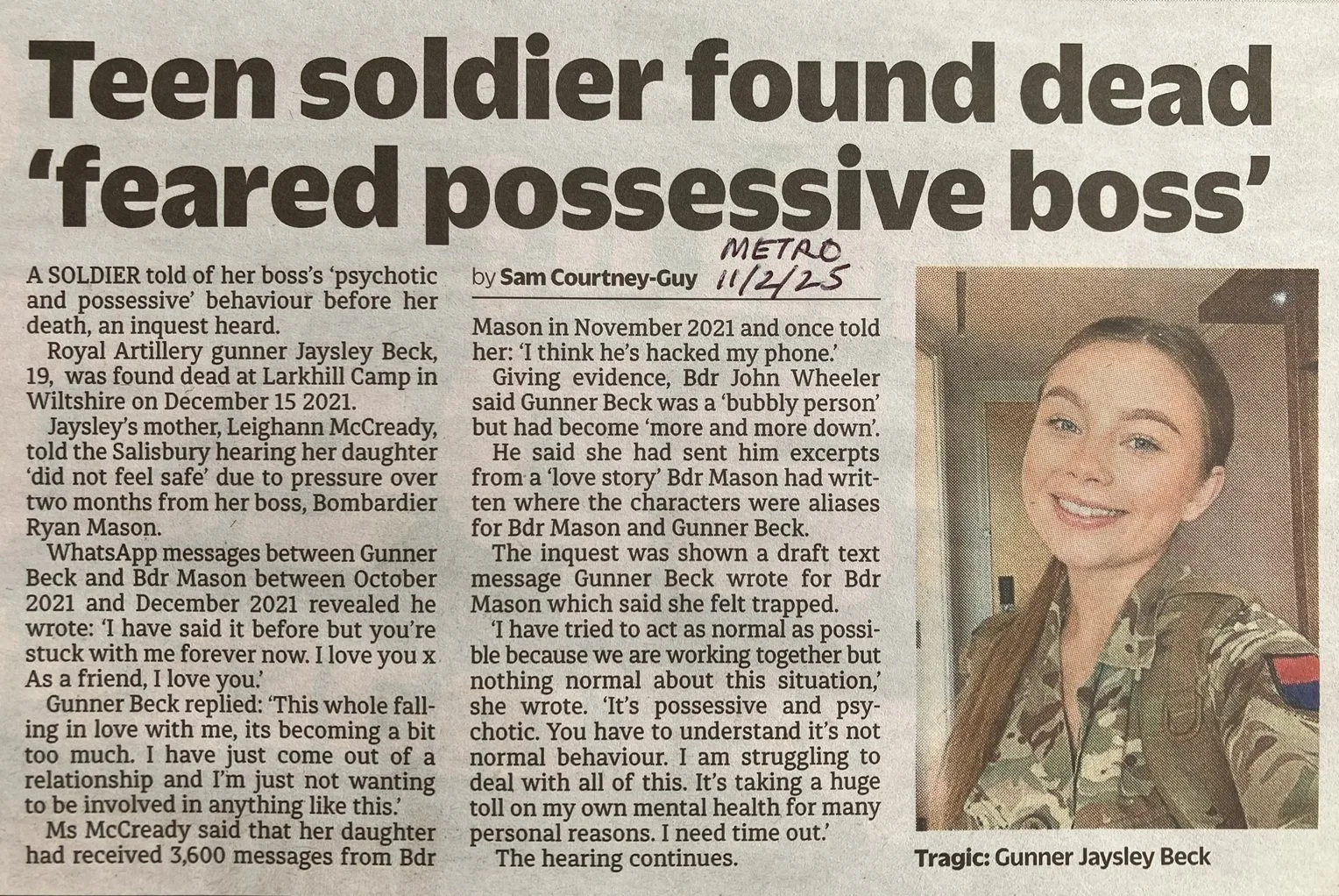 Day 42: Jaysley Beck, c2001 - 2021 Metro 11.2.25. Article by Sam Courtney-Guy. Photo uncredited. A soldier, who took her own life in 2021 at the age of 19. An inquest found the Army did not take enough action after she was assaulted by a senior sergeant. Her family is fighting for an independent body to handle serious complaints in the military.