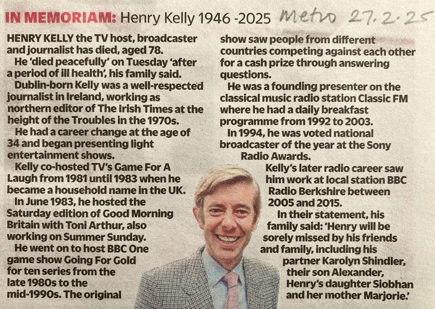 Day 59: Henry Kelly, 1946 - 2025 Metro 27.2.25. Photo uncredited.