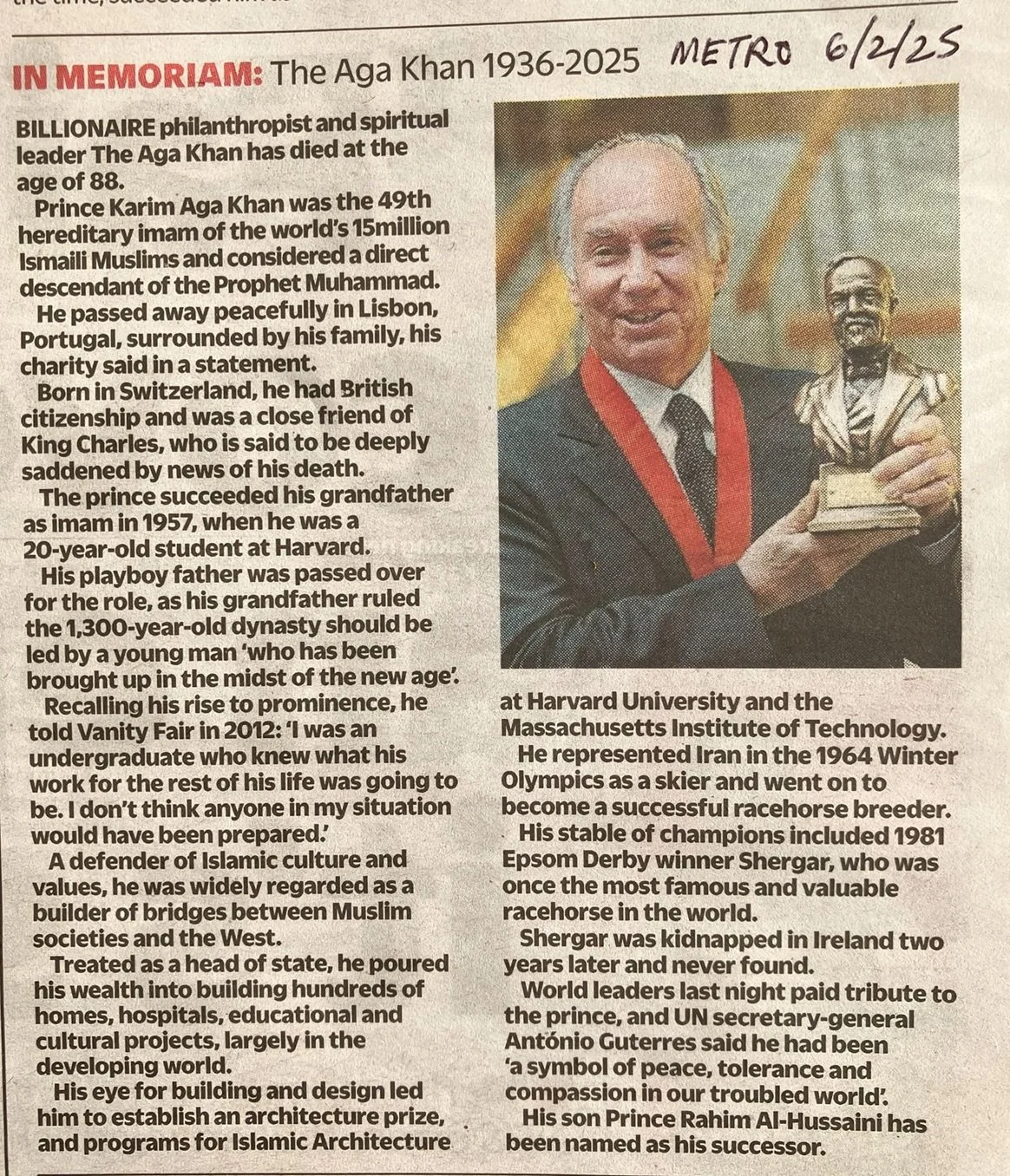 Day 37: The Aga Khan, 1936 - 2026 Metro 6.2.25.Photo uncredited.