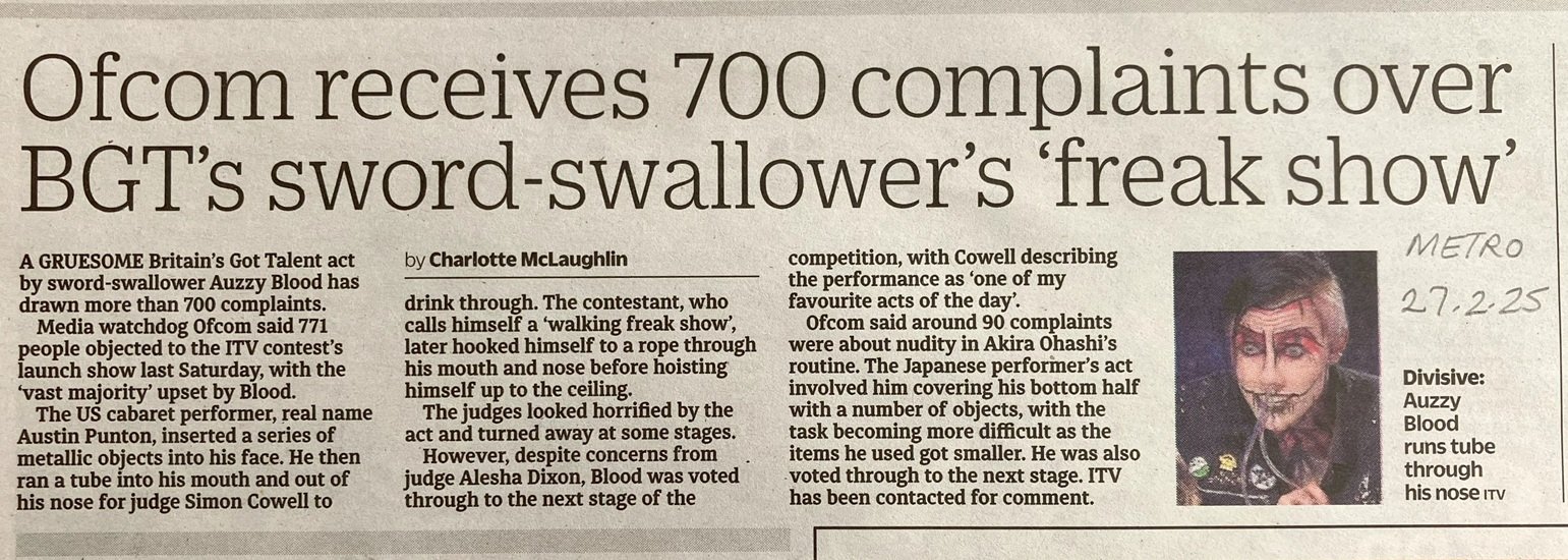 Day 58: Auzzy Blood Metro 27.2.25. Article by Charlotte McLaughlin. Photo: ITV*. Swallowed swords on 'Britain's Got Talent', resulting in 700 Ofcom complaints.