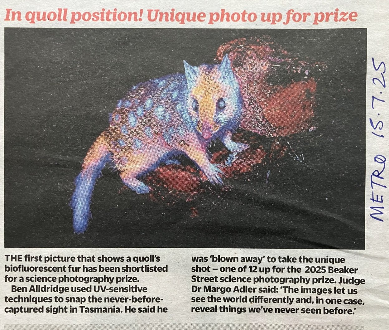 Day 196: Unnamed quoll Metro 15.7.25. Photo by Ben Alldridge, who used uv-sensitive techniques and has been shortlisted for a photography prize.
