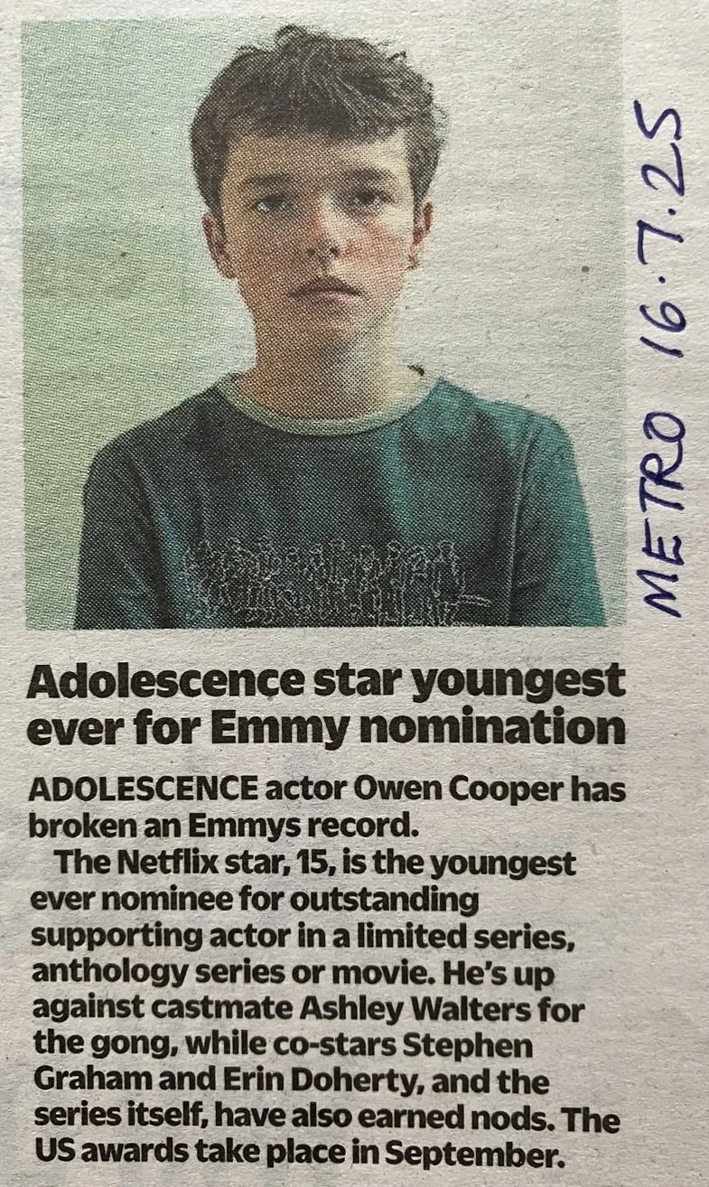 Day 197: Owen Cooper Metro 16.7.25. Photo uncredited.
