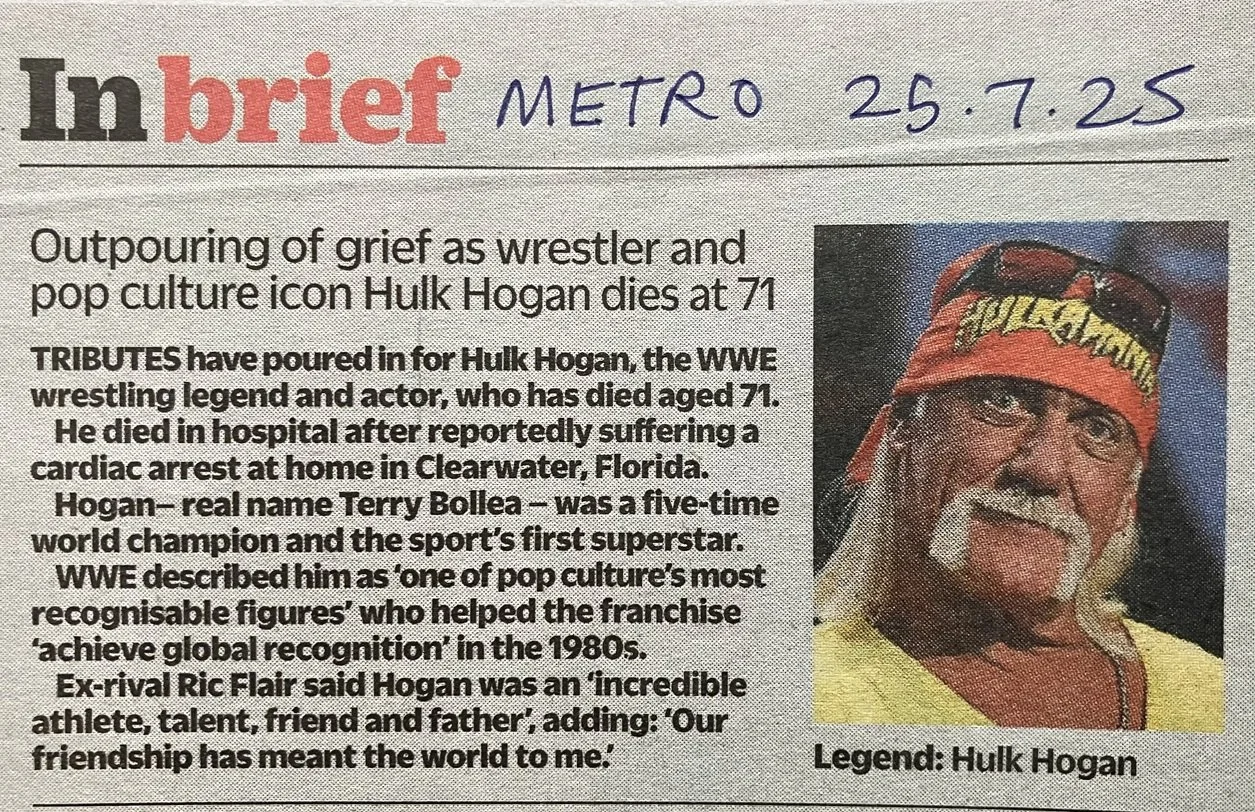 Day 204: Hulk Hogan, 1953 - 2025 Metro 25.7.25. Photo uncredited.