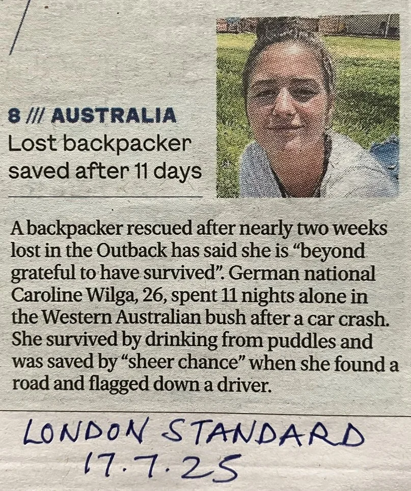 Day 195: Caroline Wilga London Standard 17.7.25. Article by Mark Wilkinson. Photo uncredited.