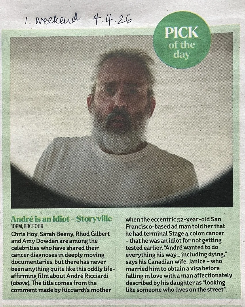 Day 100: André Ricciardi iWeekend 4.4.26, from ‘Pick of the Day’ by Gerard Gilbert. Photo uncredited.