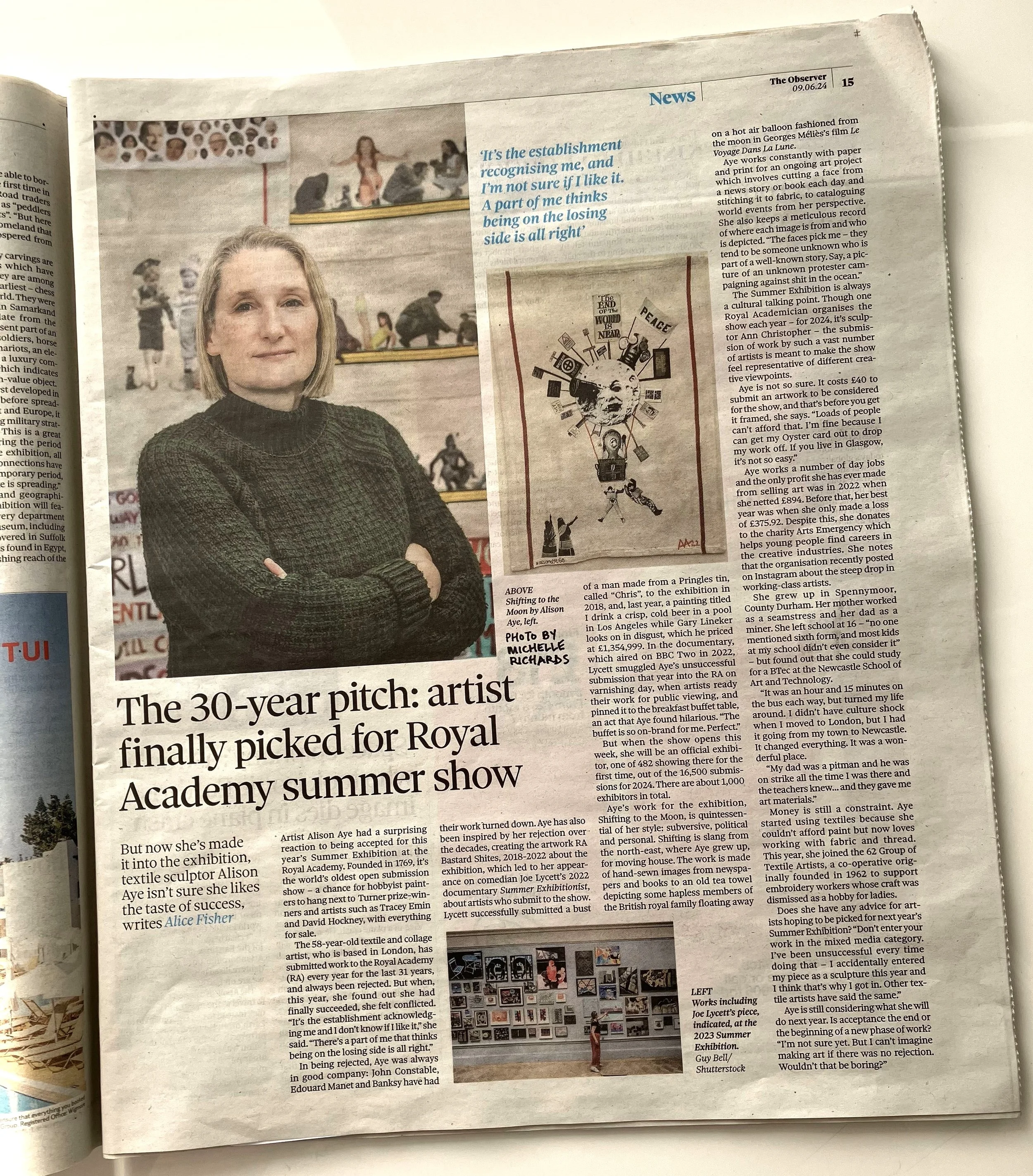 ‘After 31 attempts to be selected for the Royal Academy Summer Show, Alison Aye (featured in Embroidery, May/June 2024) has finally cracked it. The 62 Group member’s work, ‘Shifting to the Moon’, has been accepted and will join the art of 1,153 other exhibitors. The artist told the Guardian that she didn’t know if she liked being recognised by the establishment and that there was a part of her that felt OK to be on the losing side’.